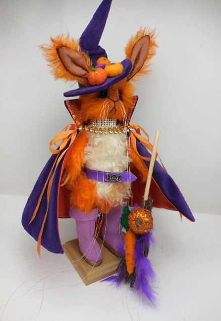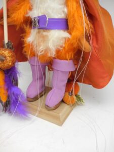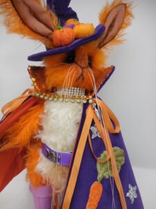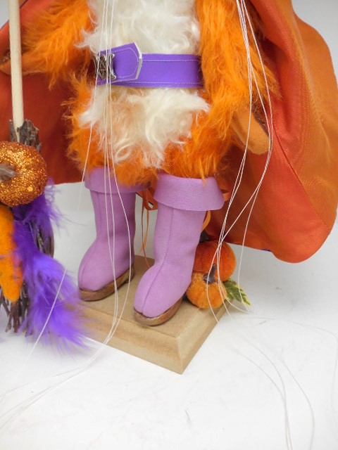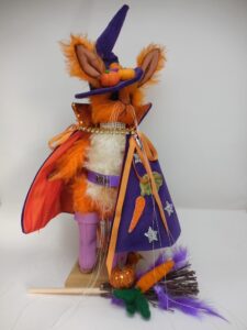 Casserole dazzles wearing a stuning hand made purple cotton velvet cape with a sequin stand up collar, the cape is lined with hot orange pure silk hand loom dupion and adorned with glittering stars and a carrot sprinkled with hot orange swarovski crystals and finished with pure silk orange ribbons, silver carrots and a stunning vintage amber and diamond chain..Around her neck she wears a diamond choker on black pure silk ribbon. Her stunning hand made purple leather belt is finished with a enamel buckle pin. Her gorgeous lilac suede real leather boots have real leather stained soles (made by a traditional cobbler) and are trimmed with orange pure silk ribbons ties at the back. Her stunning witches hat is hand made from purple cotton velvet adorned with hand made wool felt pumpkins sprinkled with swarovski crytals. She comes with her own hand made decorated besom broomstick and hand made detachable stand. All clothes are removable.