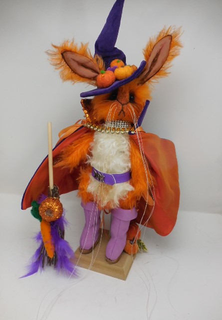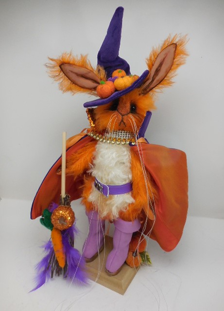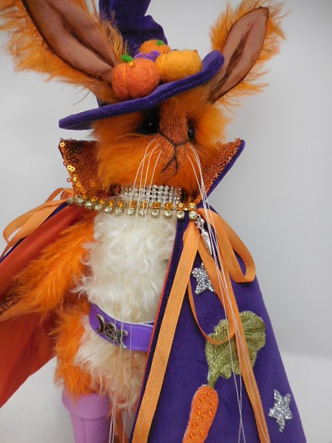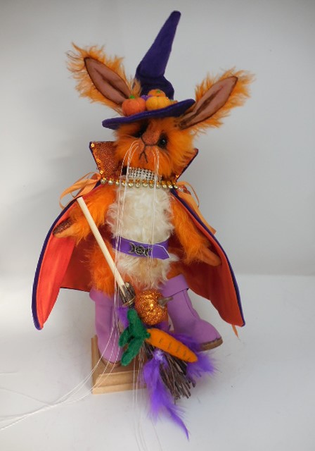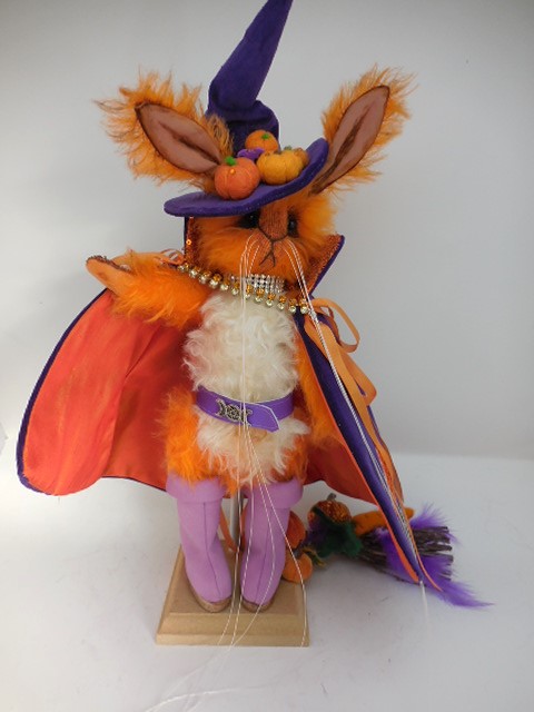 Casserole is 11 inches tall (without her ears or stand) she is created from stunning carrot orange and ivory hand dyed soft dense wavy German mohair German mohair ,her fluffy bunny tail is ivory alpaca. Her long bunny ears have pink velvet cashmere inners and are wired so you can pose her with different looks, Her face has been needle and scissor sculptured along with hand shading. She has black glass eyes and extra long nylon whiskers. She is five way jointed and hand shaded all over, her paws and feet with pale purple velvet cashmere paw pads and embroidered dark brown claws are waxed. She is filled with polyester and weighted with steel shot.