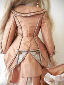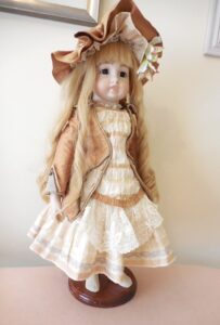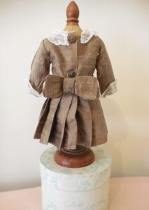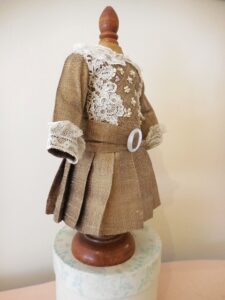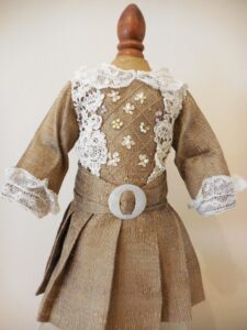 This beautiful dress is clotted cream linen which holds is shape trimmed with baby blue piping and lace and a stiff cotton underskirt, slightly drop waist and puff sleeves and a removable collar which slips over the head, popper fasteners at the back. Later added pure silk air force blue ribbon sash. The dress is in near mint condition with no damage, marks, thread pulls, holes or signs of ageing. I had this on a 19 inch doll which fitted her very well for a below the knee dress with a bit of room to move…Looked stunning.