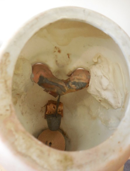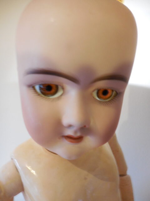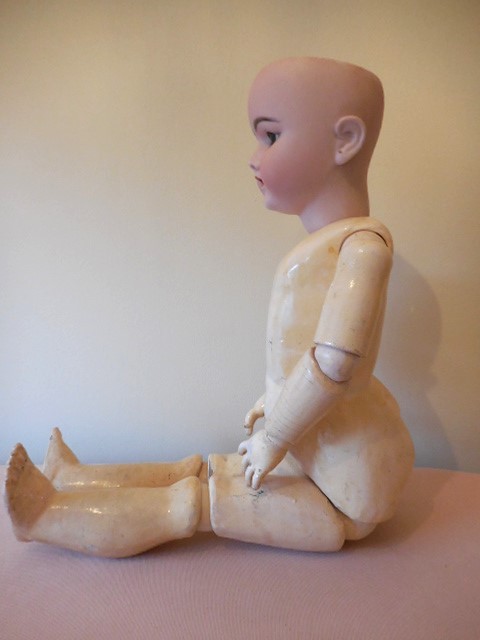 Despite this dolls faults (and she came to me like this) she is utterly beautiful, she has a pale complexion with rosy cheeks, a rose bud mouth, perfect little teeth and beautiful soft brown eyes with full wax eye lids and thick full eye lashes, her eye’s are perfectly working sleepy eyes. she has a fork hairline at the top right hand of her forehead which her fringe covers and is quite faint, as far as I can see she has no further damage to her head. There is a tiny chip to her piercing on her left lobe. Her body is well strung and she still stands well on a stand, I have had her for a number of years and bought her unknowing about her thigh, it hasn’t stopped her posing for me but she can’t really sit and as you can see for her photo’s her leg is lifted when laying. I believe it is her sturdy stringing that is keeping the leg in place which is why I didn’t notice for a while!! I’m sure she would continue to stand well for a long while yet without fixing but it would be recommended that she have some surgery at some point….Other than the faults mentioned her body is in good condition for it’s age, she has all of her fingers and toes and other than her poorly leg she moves well to pose.