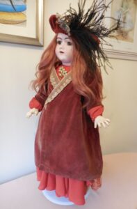 I have had her for a few years and she is wearing exactly what I bought her in….Her outfit is divine…She wears white diamond pattern socks, little real leather tan shoes with black pure silk ribbon bows, there is a buckle missing off of one of her shoes but they are so sweet I have kept them like this. She wears layers of antique petticoats and frilly antique bloomers. I’m not sure of the age of her dress but it’s a pretty burnt orange/red colour with panels of lace and a lace cowl neck, I would say it is defiantly vintage is not older with long puff sleeves and silver popper fasteners at the back, it’s made I think from a georgette fabric, it has a couple of tiny tiny little nibble holes in the skirt but nothing major. She wears a vintage/antique brooch on her dress. Her rust coloured velvet cotton coat is just stunning, it has three quarter sleeves, silk lines, trimmed with lace and fastens with poppers and hook and eye, I’m again not sure of it’s age but it’s pretty old definitely vintage, looks to have been beautifully hand made and has a nice full back to it. Her gorgeous little velvet hat is finished with a splendid plume of black ostrich feather and is finished at the front with a braid motif and vintage/antique brooch. An absolutely stunning doll which I have been thrilled to own :0)