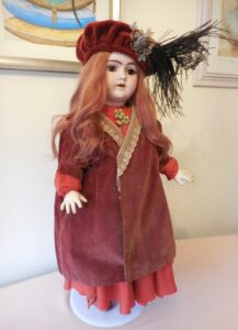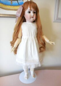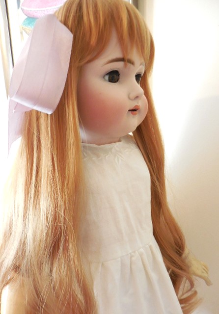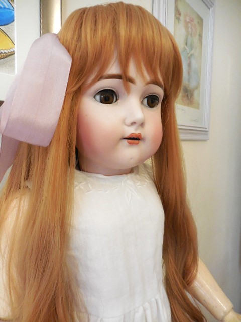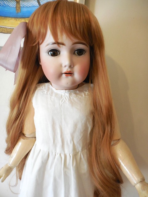 This beautiful girl has large brown working sleepy almond eyes, she has a beautiful pale bisque complexion with rosy cheeks, a rose bud mouth and all of her tiny little teeth. Her head has no hairline cracks or damage. She has all of her wax. She wears a gorgeous auburn red long, thick human hair replacement wig. Her body is stamped Henrich Handwerck (see photo’s). She poses well sitting or on a stand, she is well strung and has all of her little fingers and toes. There is some slight ageing to her body which is to be expected of a doll of her age but nothing major…See photo’s.