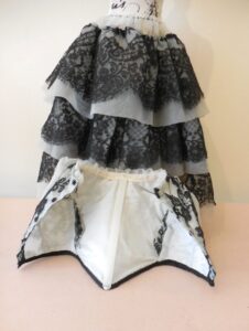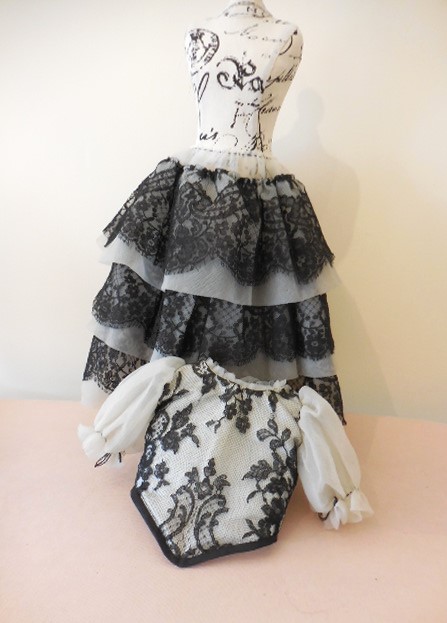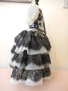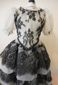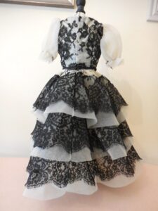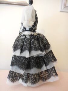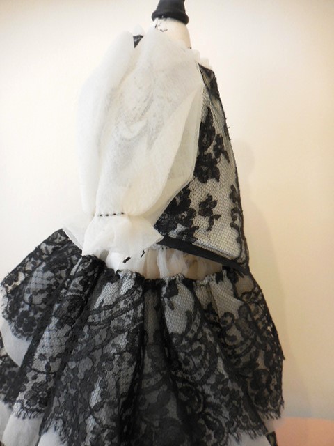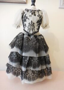 Very pretty ivory and black lace and organza dress for antique doll 20 inches….See measurements