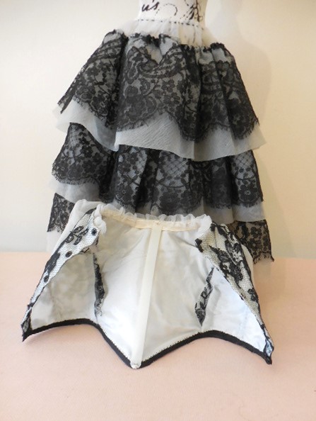 Skirt has layers of lace and organza tiers with a straw string waist and is very full when pulled in. The pretty matching bodice/top has a reinforced front panelled with plastic reinforcements (see photo’s) and drawstring puffed sleeves with pooper fasteners at the back. I’m not sure of it’s age possibly vintage…very pretty little outfit :0)
