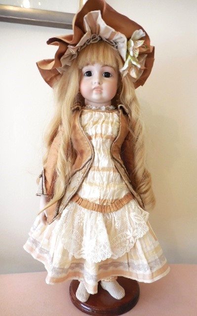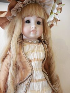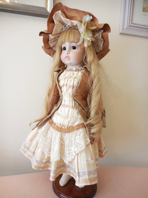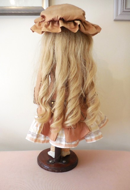 Beautiful face with working sleeping brown eyes, original eyes lashes no cracks or hairlines to her head most of her wax. Slight rub to tip of nose. stunning quite pale complexion with perfect little teeth and rosebud mouth, she has pierced ears with droplet earrings. Body very good condition for it’s age please see the photo’s, it has some signs of ageing which I’ve tried to capture in the photo’s and nibbles to the toes on the right foot, the body is very well strung and sturdy, she stands (on a stand) sits and poses perfectly. She has all her fingers and most of her toes. Original cork pate. stunning antique very Long brown human hair wig which can be put in pony tails, I think it’s original but can’t be sure. She is wearing a Ivory pure silk dupion dress layers of petticoats, bloomers, crochet pink socks, stunning large straw bonnet adorned with pure silk and satin ribbons, lace feathers and silk flowers, little vintage brooch and burgundy leather shoes with silk roses.