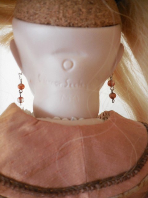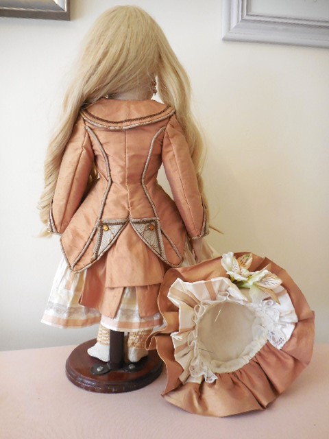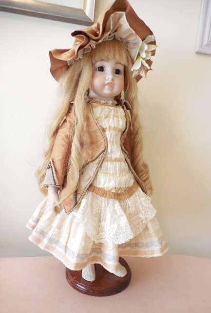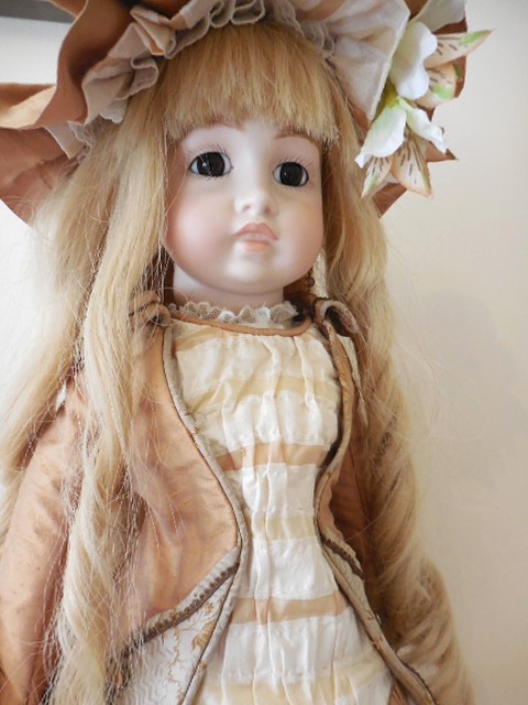 I can not give this stunning dolls with her wonderful outfit enough compliments, she is absolutely beautiful and a delight to display. she has a pale complexion with dark brown fixed eyes, rose bud mouth and rosy cheeks. Her head is in perfect condition and free from cracks and hairlines, she has pierced ears and a cork pate which has been firmly glued. On the back of her head she is marked Vernon Seeley 1979. She has a soft body and perfect bisque/porcelain limbs without damage. she comes with a beautiful very long human hair platinum blonde ringlet wig, it needs a little tidy up from flyaway hair but is beautifully clean and falls into perfect long ringlets. Her outfit is just stunning, she has a pure silk dupion dress with soft cotton lace in shades of pale gold, her old gold jacket is adorned with amber gem and is attached to the dress with poppers. she has a matching pure silk dupion hat with silk lily flower and lace.She has ivory bloomers and a matching full petticoat along with complimentary crotchet socks and drop earrings. A truly stunning doll who just needs a new home and a pair of lovely shoes :0)