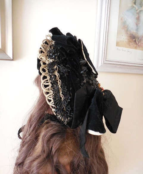 This wonderful antique (I believe) bonnet has it all, it is just amazing…Black cotton velvet lined with black silk and long black velvet ribbon for under the chin, Witred at the front and quite a weight to the hat, it has a lace panel at the back and is covered with black velvet bows and black silk taffeta bows, beige cord type lace and black jet crystals, some have come away a little and cold do with fixing back although it looks charming like this and there are lots of them, it’s finished with a tiny pink silk rose at the back. The label inside I think says C J Fox & Co although it’s a little hard to see and is printed in gold. Really stunning bonnet.