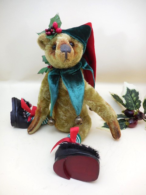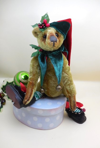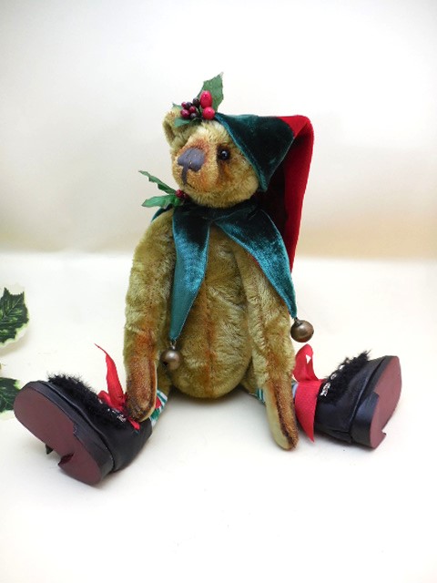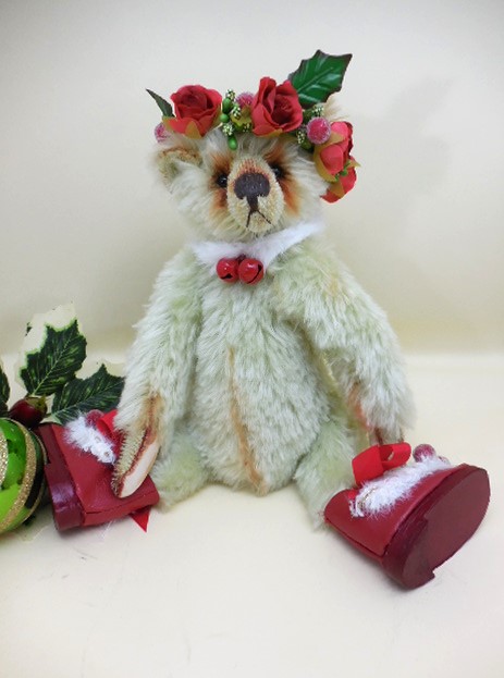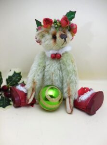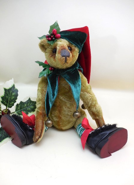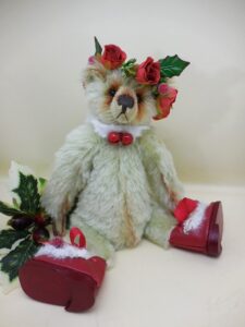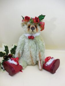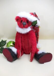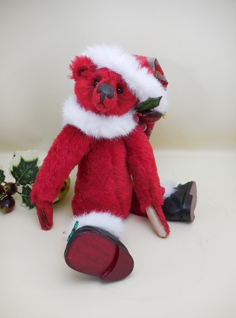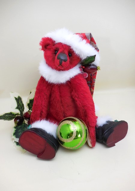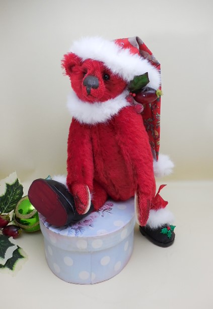 Mr Nicholls is 11 inches tall and created from sumptuous thick silky Christmas red German mohair. He is five way cotter pin jointed with a wobble joint neck. His adorable face has been needle and scissor sculpted, his eyes are black glass, he has hand shading for an all over aged and loved look. His embroidered chocolate nose has been waxed to match his waxed claws which compliment his ivory velvet cashmere paw pads. He has been filled with wood wool and steel shot in his body and paws for a lovely cuddly weight.