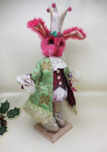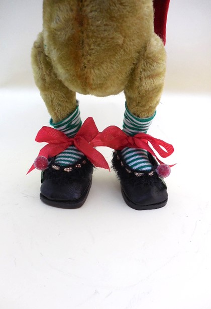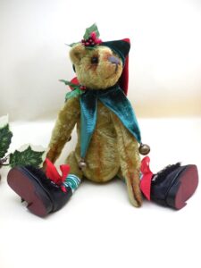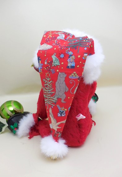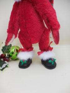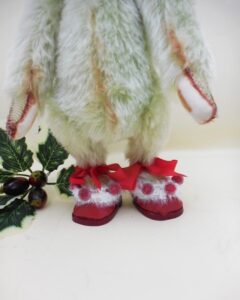 Mr Nicholls wears a festive hand made hat created from vintage Liberty Christmas animals lawn fabric lined with Christmas red pure silk hand loom dupion and trimmed with super soft white faux fur and finished with a large ringing bell. Around his neck he wears a wintery warm ruff of super soft faux fur adorned with a hand made corsage of festive berries. His gorgeous hand made shoes are real black leather and have real leather stained soles made by a traditional cobbler finished with white faux fur, glittering holly embellishments and red silk rayon ribbon…A bit too designer for climbing down chimneys don’t you think…