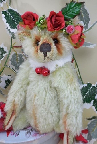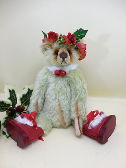 Narnia is 11 inches tall and created from gorgeous thick silky pistachio German mohair. He is five way cotter pin jointed with a wobble joint neck. His adorable face has been needle and scissor sculpted, his eyes are black glass, he has hand shading for an all over aged and loved look. His embroidered chocolate nose has been waxed to match his waxed claws which compliment his ivory velvet cashmere paw pads. He has been filled with wood wool and steel shot in his body and paws for a lovely cuddly weight.