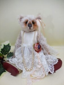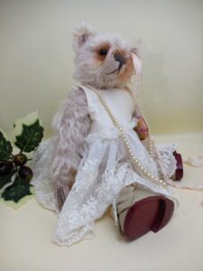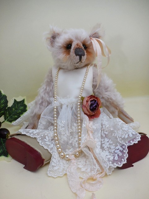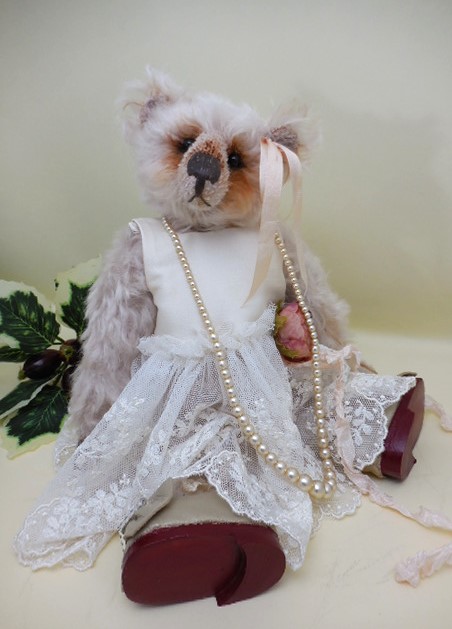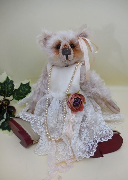 Sugar Almond is 11 inches tall and created from gorgeous hand dyed alabaster pink (cream with a hint of pink) thick wavy German mohair. She is five way cotter pin jointed with a wobble joint neck. Her beautiful face has been needle and scissor sculpted, her eyes are black glass, she has hand shading for an all over aged and loved look. Her embroidered chocolate nose has been waxed to match her waxed claws which compliment Ivory velvet cashmere paw pads. She has been filled with wood wool and steel shot in her body and paws for a lovely cuddly weight.