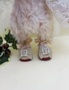We all like a sweetie at Christmas and Sugar Almond is an adorable little treat. Dressed in a beautiful hand made frock created from ivory hand loom silk dupion for the bodice with a beautiful embroidered genuine antique lace and trimmed in silk rayon crinkle ribbons and an antique style silk peonies. Her pretty shoes are hand made real soft pearl gold leather with real leather stained soles made by a real traditional cobbler, the shoes are trimmed with diamanté buckles and leather bows with silk rayon ribbon ties. In her ear she wears a oyster pure silk ribbon bow and to finish her look she has a string of creamy real vintage pearls…Sure to be the darling any Christmas gathering.