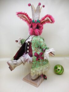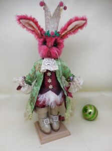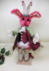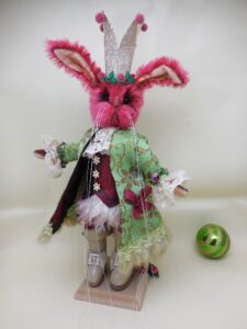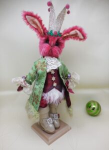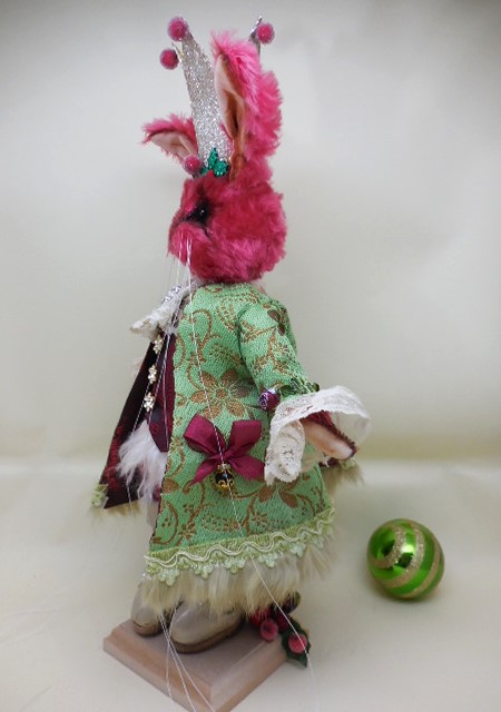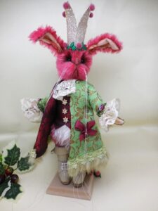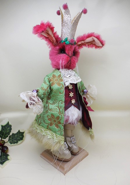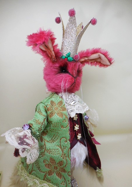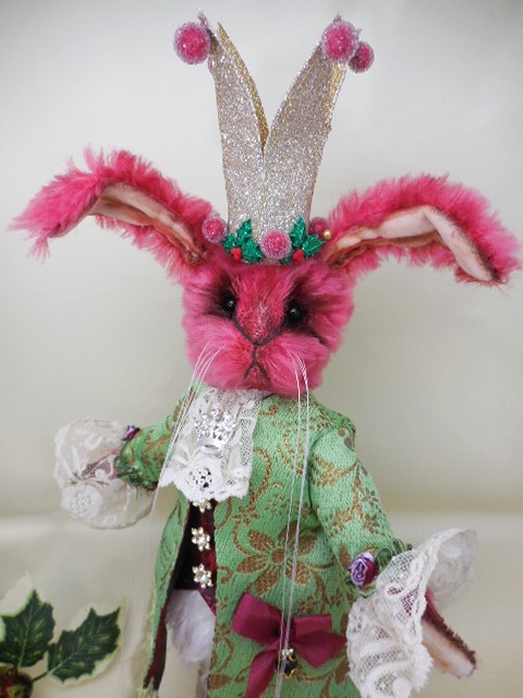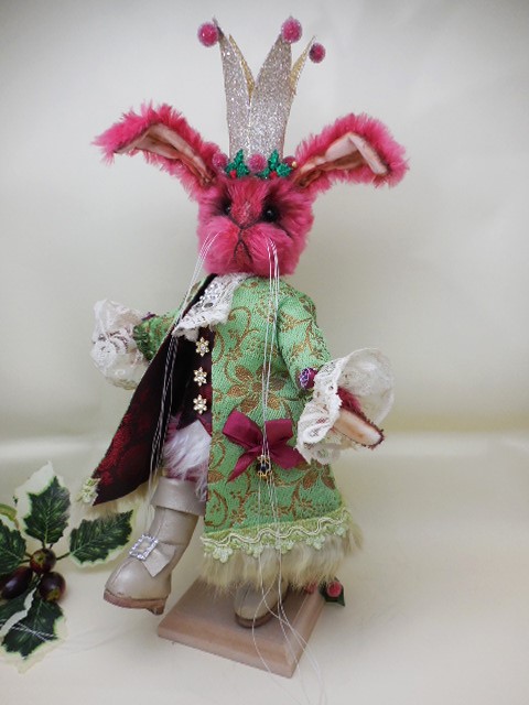 The Jingle bell of the Christmas ball Seigneur Tarte Au Lapin is wearing a fine hand made frock coat created from lime and gold floral brocade jacquard lined with deep cranberry paisley lining and trimmed with real fur braid, satin vintage roses and a cranberry rose with bauble. His stunning Christmas waistcoat is deep Christmas Cranberry paisley lined with deep red hand loom silk dupion and trimmed with floral diamanté mock buttons down the front. Around his neck and wrists he wears beautiful hand made cream gold real antique lace cuffs and cravat adorned with a sparkling crown…Why not he’s special…On his feet he ears the most stunning hand made pearl gold leather cavalier boots with real leather soles (made by a real traditional cobbler) and trimmed with diamond leather bow buckles. Just so that you know who he is when he enters the Christmas party Seigneur Tarte Au Lapin is wearing a glittering hand made gold crown trimmed with sparkling festive holly and frosted berries…Lord Rabbit pie anyone?