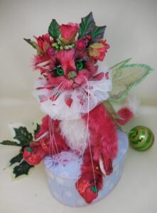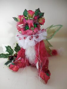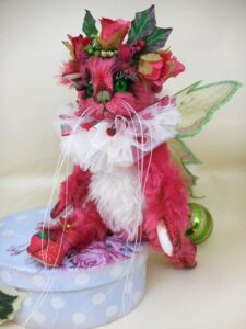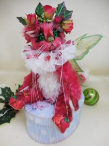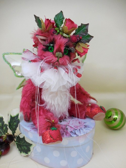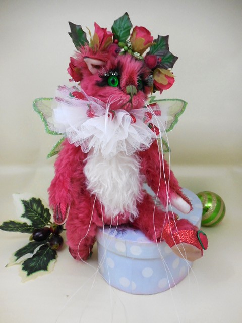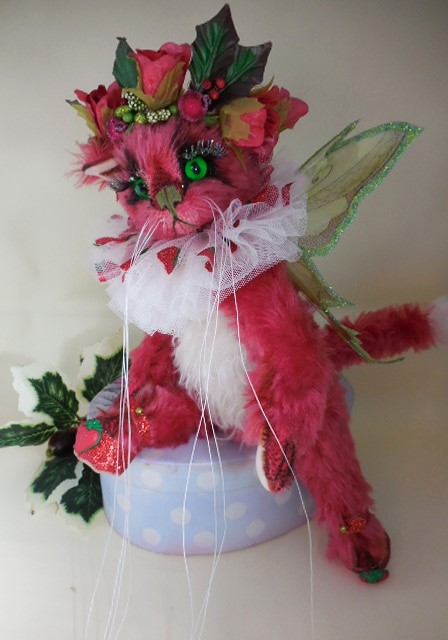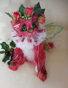 Fluttering about and hidden deep in the wintery woods this little fairy kitty wears a stunning hand made magical crown of red silk roses, holly sprigs, green berries and winter frosted berries. Around her neck she wear a frothy ruff of white soft tulle over laid with sparkling strawberry print tulle. Her hand made fairy slippers are created from red glitter fabric and finished with lime pearl buttons and strawberry’s on her toes. Her beautiful hand made removable fair wings are sprinkled in green fairy dust and adorned with peridot swarovski crystals.