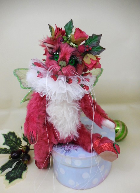 The beautiful mystical winter strawberry fairy is 11 inches tall and created from a gorgeous one of piece of strawberry red hand dyed (not the same as the bunny in the show) German mohair and long ivory German mohair. She is five way cotter pin jointed with a wired pose able tail. She has stunning large bright green hand painted glass eyes lidded with frosted glitter real lashes and peridot swarovski crystals and long nylon whiskers. Her stunning face has been needle and scissor sculpted. Her pussy cat strawberry green nose and dark brown claws have been embroidered and waxed and compliment her white velvet cashmere paw pads. She has been filled with polyester and steel shot.