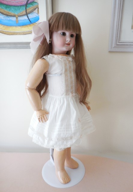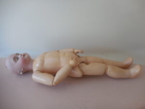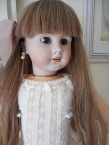 Despite this dolls faults (and she came to me like this) she is utterly beautiful, she has a pale complexion with rosy cheeks, a rose bud mouth, perfect little teeth and beautiful soft brown eyes with full wax eye lids and thick full eye lashes, her eye’s are perfectly working sleepy eyes. she has a fork hairline at the top right hand of her forehead which her fringe covers and is quite faint, as far as I can see she has no further damage to her head. There is a tiny chip to her piercing on her left lobe. Her body is well strung and she still stands well on a stand, I have had her for a number of years and bought her unknowing about her thigh, it hasn’t stopped her posing for me but she can’t really sit and as you can see for her photo’s her leg is lifted when laying. I believe it is her sturdy stringing that is keeping the leg in place which is why I didn’t notice for a while!! I’m sure she would continue to stand well for a long while yet without fixing but it would be recommended that she have some surgery at some point….Other than the faults mentioned her body is in good condition for it’s age, she has all of her fingers and toes and other than her poorly leg she moves well to pose.