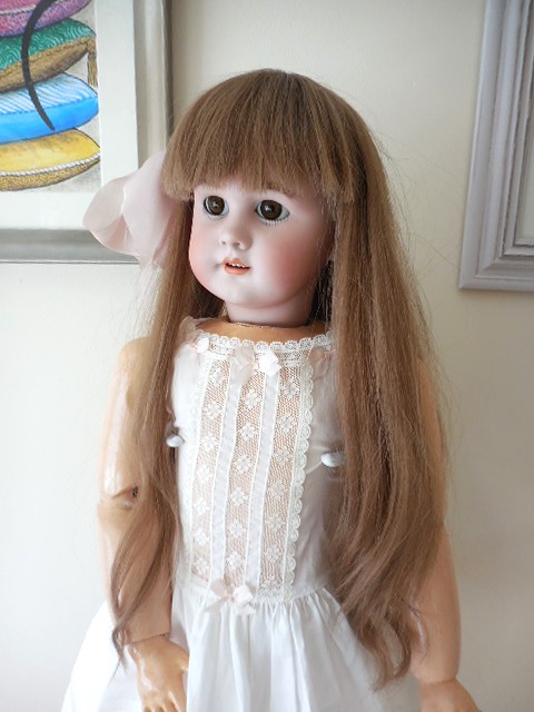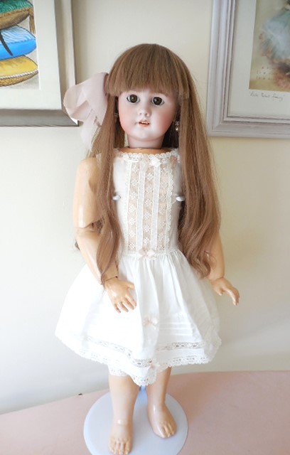 Beautiful face with working sleeping brown eyes, original eyes lashes no cracks or hairlines to her head most of her wax. Slight rub to tip of nose. stunning quite pale complexion with perfect little teeth and rosebud mouth, she has pierced ears with droplet earrings. Body very good condition for it’s age please see the photo’s, it has some signs of ageing which I’ve tried to capture in the photo’s and nibbles to the toes on the right foot, the body is very well strung and sturdy, she stands (on a stand) sits and poses perfectly. She has all her fingers and most of her toes. Original cork pate. stunning antique very Long brown human hair wig which can be put in pony tails, I think it’s original but can’t be sure. She is wearing a Ivory pure silk dupion dress layers of petticoats, bloomers, crochet pink socks, stunning large straw bonnet adorned with pure silk and satin ribbons, lace feathers and silk flowers, little vintage brooch and burgundy leather shoes with silk roses.