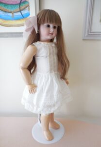 This beautiful dress is clotted cream linen which holds is shape trimmed with baby blue piping and lace and a stiff cotton underskirt, slightly drop waist and puff sleeves and a removable collar which slips over the head, popper fasteners at the back. Later added pure silk air force blue ribbon sash. The dress is in near mint condition with no damage, marks, thread pulls, holes or signs of ageing. I had this on a 19 inch doll which fitted her very well for a below the knee dress with a bit of room to move…Looked stunning.