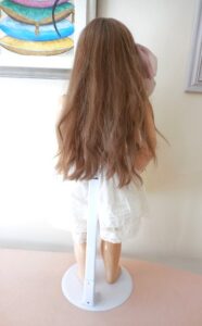 she comes with her replacement very long new synthetic French strawberry blonde wig, pure silk ribbon hair bow, vintage petticoat and bloomers and lace stocking.